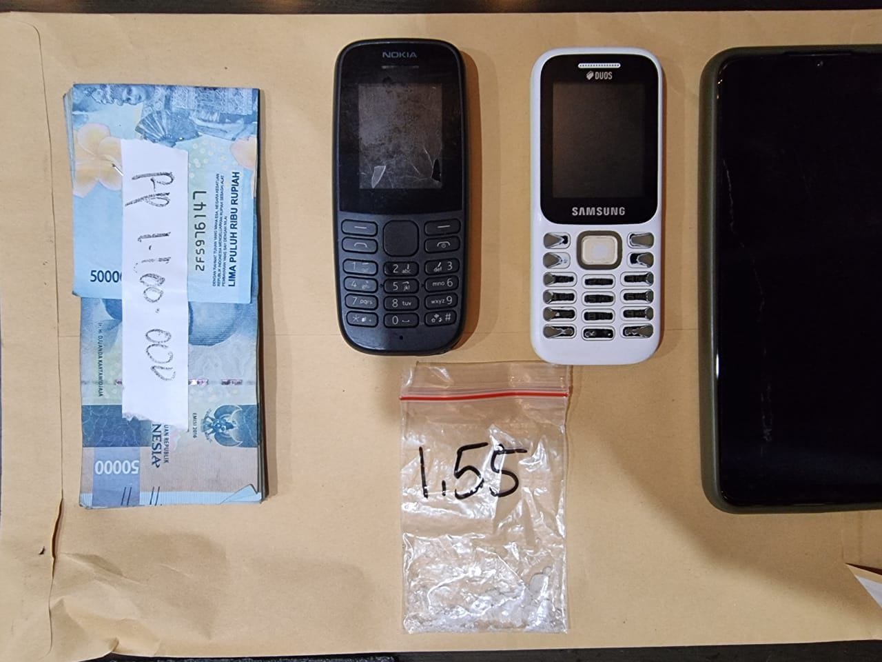 “Dari tangan kedua pelaku sedikitnya kami mengumpulkan barang bukti 1,55 gram brutto sabu, 1 unit HP samsung, 1 unit HP Oppo biru, 1 unit HP Nokia, serta uang tunai hasil penjualan sabu senilai Rp 1,1 Juta,” sebut Iptu Purwanto.