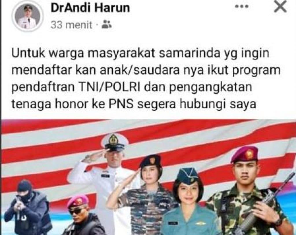 Dalam postingan akun itu, nampak sipembuat akun menuliskan “Untuk masyarakat Samarinda ingin mendaftar anak/saudara ikut program pendaftaran TNI/Polri dan pengangkatan tenaga honorer hubungi saya”.