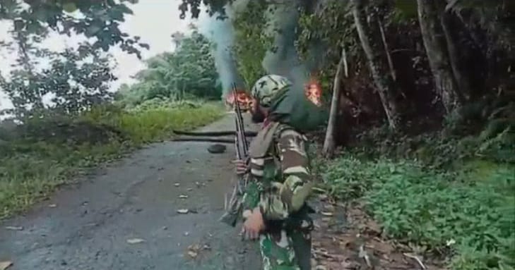 Melalui video yang beredar, terlihat anggota KKB dengan menggunakan pakaian loreng dan membawa senjata laras panjang membakar mobil polisi. Sambil teriak, anggota KKB itu menembakkan senjata apinya.