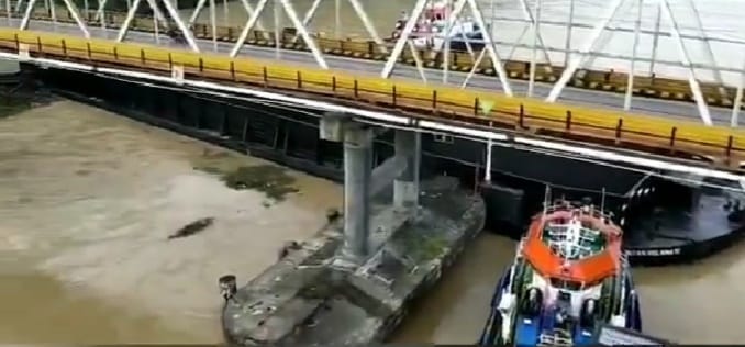Dari rekaman video yang didapat apakabar.co kapal tongkang penabrak pondasi jembatan tersebut tengah dalam evakuasi yang dilakukan oleh dua kapal tugboat.