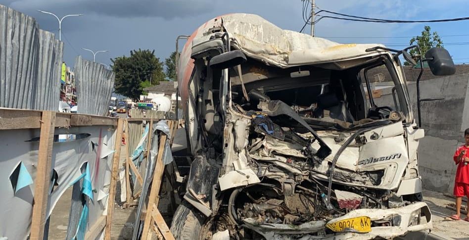“Truk ready mix sempat menyenggol angkot kemudian karena tidak seimbang dan gagal lakukan pengereman akhirnya banting ke kiri sehingga menabrak pembatas seng proyek,” kata Kompol Ropiyani.