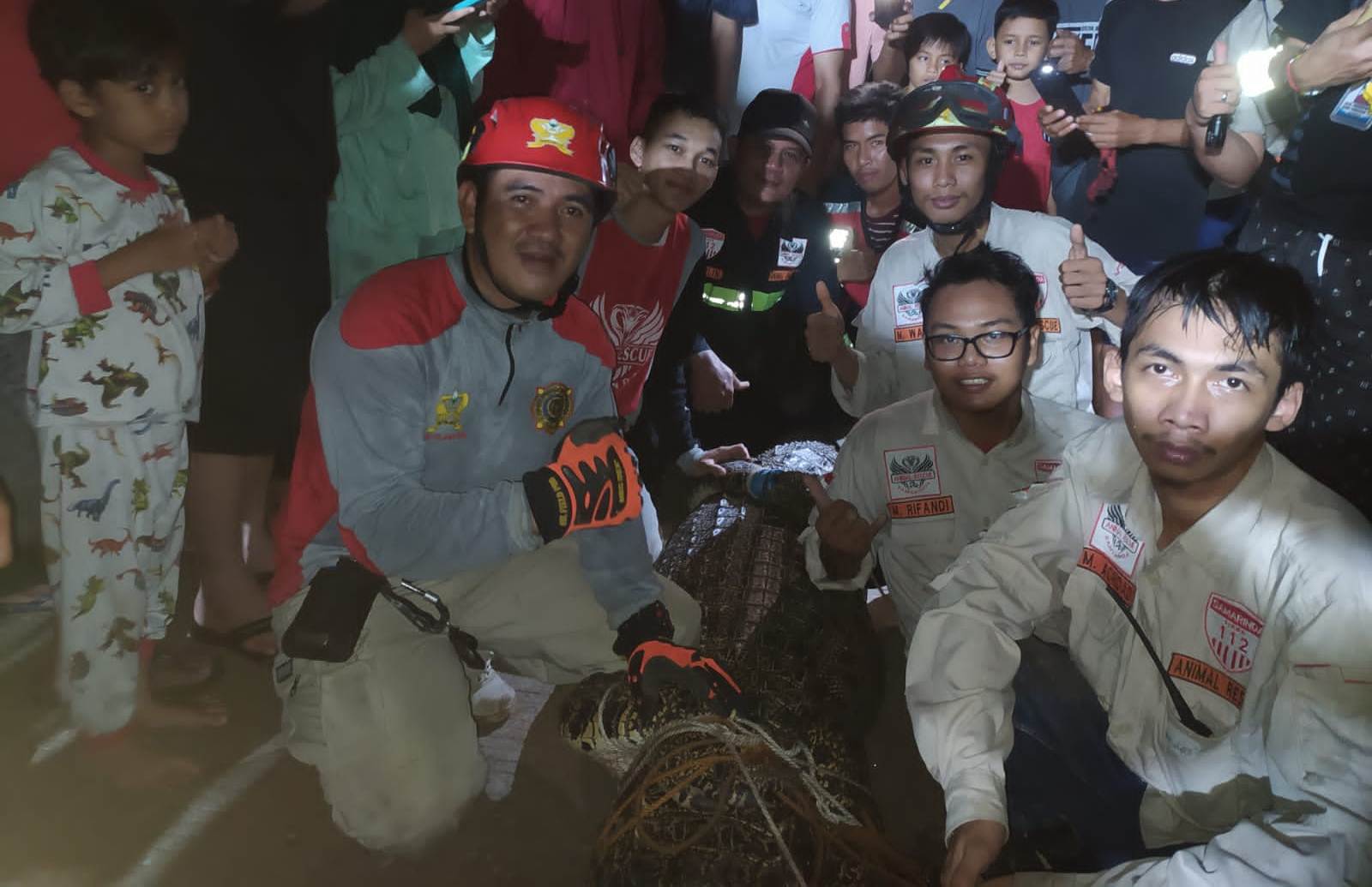 Tepat pukul, 23.15 Wita, pihak Damkar dan relawan animal rescue di bantu warga berhasil menangkap buaya tersebut dengan cara menggunakan tali yang di sangkutan di mulut buaya.